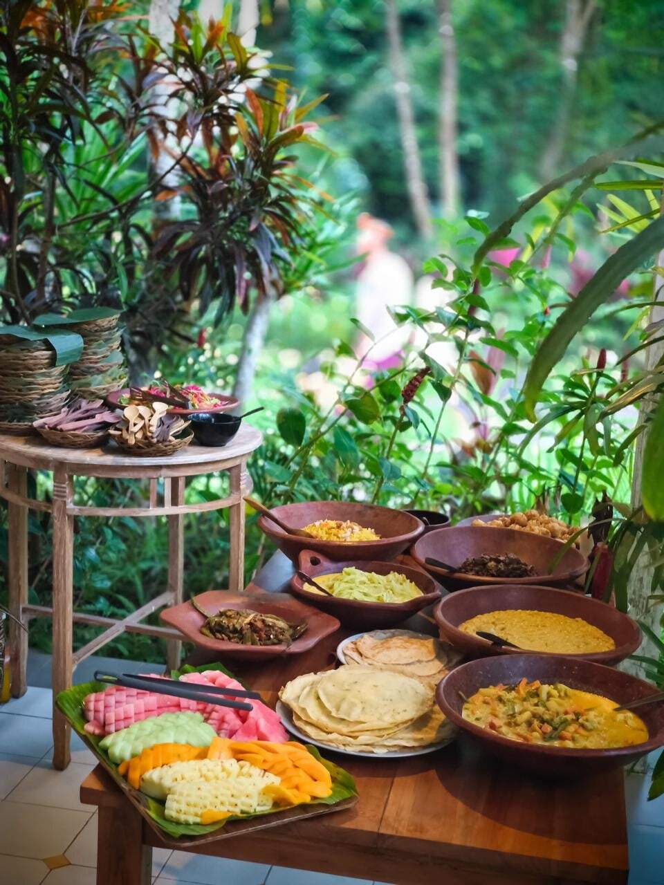 At the villa, enjoy three daily meals served as a nourishing organic vegetarian and vegan buffet, thoughtfully prepared to support your well-being and dietary needs.